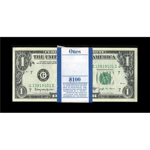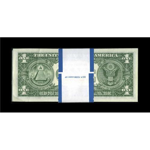 <B>Fr. 1902-B $1 1963B Federal Reserve Notes. Original Pack of 100. Gem Crisp Uncirculated.</B></I><BR>This pack went straight from the teller to the bank patron's safe deposit box where it reposed for nearly 40 years.<BR><BR><b>Shipping:</b> Coins & Currency (<a target="_blank" href="http://www.heritageauctions.com/common/shipping.php">view shipping information</a>)