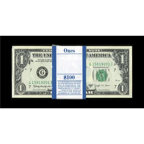 <B>Fr. 1902-G $1 1963B Federal Reserve Notes. Original Pack of 100. Gem Crisp Uncirculated.</B></I><BR>Only a couple of the notes show handling in this pack that was put away in the late 1960s.<BR><BR><b>Shipping:</b> Coins & Currency (<a target="_blank" href="http://www.heritageauctions.com/common/shipping.php">view shipping information</a>)