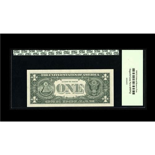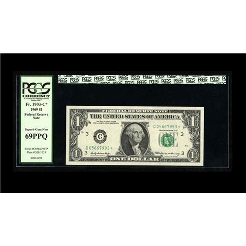 <B>Fr. 1903-C* $1 1969 Federal Reserve Note. PCGS Superb Gem New 69PPQ.</B></I><BR>Little can be said about near-perfection except, "I challenge you to find a better example." A complete aside to its lofty grade, the Series 1969 Philadelphia $1 Star is one of the keys of late date $1 Stars with only 416,000 notes printed. Our estimate here tonight is merely an attempt to venture into the mind of the collector who wants the very best.