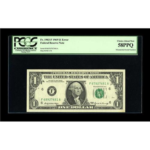 <B>Fr. 1903-F $1 1969 Federal Reserve Note. PCGS Choice About New 58PPQ.</B></I><BR>This F68/F67 mismatch has encountered a soft center fold.<BR><BR><b>Shipping:</b> Coin/Currency (<a target="_blank" href="http://www.heritageauctions.com/common/shipping.php">view shipping information</a>)