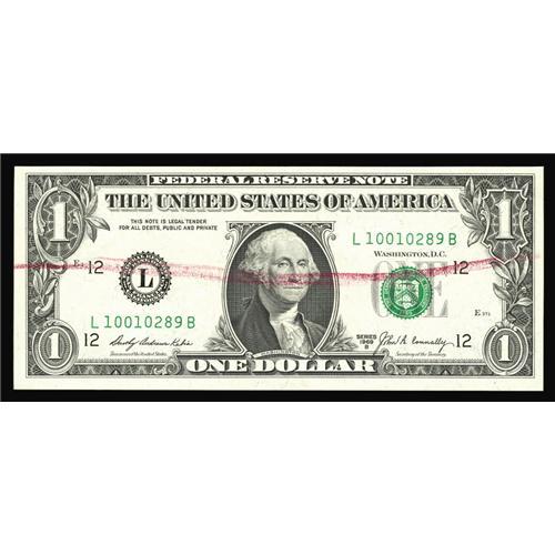 <B>Fr. 1905-L $1 1969B Federal Reserve Note. Gem Crisp Uncirculated.</B></I> This interesting error has a 100% face on back offset. It also carries a BEP inspector's red crayon rejection slash across the entire front of the note, which of course still did not prevent its release into circulation.