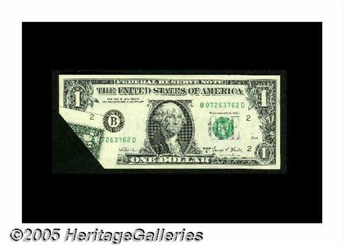 <B>Fr. 1907-B $1 1969-D Federal Reserve Note. Gem Crisp Uncirculated.</B></I> The lower right corner is folded over so that a portion of the left seal and serial number are printed on the back of the note.