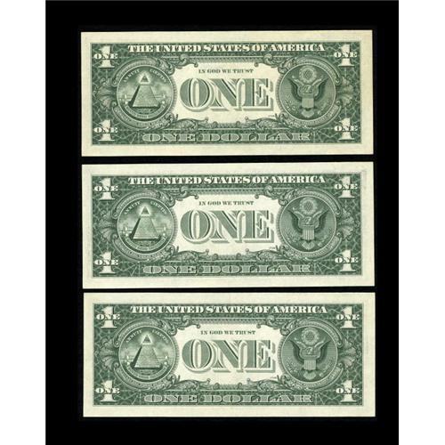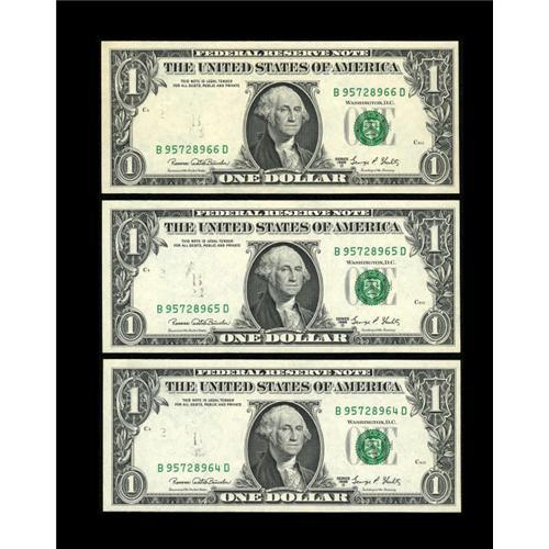 <B>Fr. 1907-B $1 1969D Federal Reserve Notes. Three Consecutive Examples. Very Choice Crisp Uncirculated.</B></I><BR> This neat trio shows a progressive emptying of the black ink reservoir for the third printing as only a faint remnant is visible.<BR><BR><b>Shipping:</b> Coins & Currency (<a target="_blank" href="http://www.heritageauctions.com/common/shipping.php">view shipping information</a>)