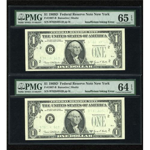 <B>Fr. 1907-B $1 1969D Federal Reserve Notes. Two Consecutive Examples PMG Gem Uncirculated 65 EPQ & Choice Uncirculated 64 EPQ.</B></I><BR> Both of these pristine errors exhibit insufficient inking of the green portion of the third printing.<BR><BR><b>Shipping:</b> Coins & Currency (<a target="_blank" href="http://www.heritageauctions.com/common/shipping.php">view shipping information</a>)