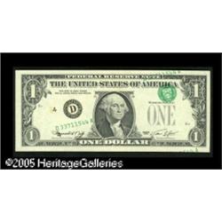 <B>Fr. 1908-D $1 1974 Federal Reserve Note. Crisp Uncirculated.</B></I> The third printing runs diagonally across the face of this Cleveland $1 that has a couple of small spots on its left hand side. Lot:15235