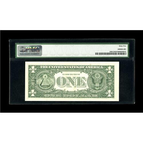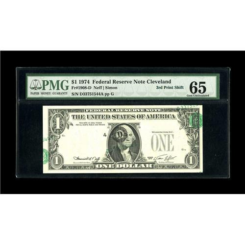 <B>Fr. 1908-D $1 1974 Federal Reserve Note. PMG Gem Uncirculated 65.</B></I><BR>This is a nifty skewed third print that shows two partial green seals and serials shifted up and to the right. The district seal and serial have landed smack dab in the middle of the portrait.<BR><BR><b>Shipping:</b> Coin/Currency (<a target="_blank" href="http://www.heritageauctions.com/common/shipping.php">view shipping information</a>)