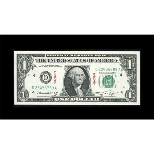 <B>Fr. 1908-D $1 1974 Specimen Federal Reserve Note. Superb Gem Crisp Uncirculated.</B></I><BR>This is an absolutely perfect piece with a ladder serial number and the word "SPECIMEN" appearing on the face twice in red and once in red on the reverse. It was formerly lot 15561 of our Taylor Family sale, where it realized $1495.