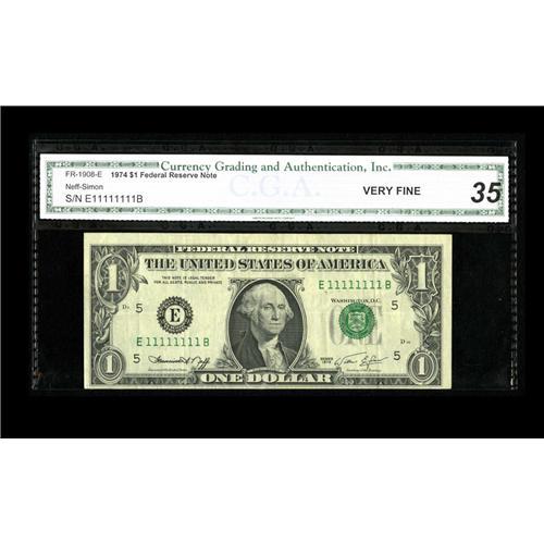 <B>Fr. 1908-E $1 1974 Federal Reserve Note. CGA Very Fine 35.</B></I><BR>Solid serial E11111111B on this circulated Richmond example.<BR><BR><b>Shipping:</b> Coin/Currency (<a target="_blank" href="http://www.heritageauctions.com/common/shipping.php">view shipping information</a>)