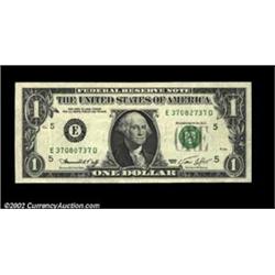 Fr. 1908-E $1 1974 Federal Reserve Note. Extremely Fine-About Uncirculated. Mismatched serial numbers E37080737D/E37082737D, an interior mismatch we have never or (nor even seen) until the arrival of this barely circulated example. Important notice: We expect to be auctioning lots at the rate of 200-250 per hour. Sometimes eBay Premier live bid software cannot keep up with that pace, so we strongly recommend that you place a realistic proxy bid now as insurance to avoid disappointment. Also please note that all Heritage/CAA lots purchased through eBay Premier carry a 20% Buyer's Premium. Please make sure you read the Terms and Conditions.