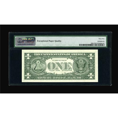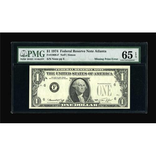 <B>Fr. 1908-F $1 1974 Federal Reserve Note. PMG Gem Uncirculated 65 EPQ.</B></I><BR> The serial number and Treasury Seal green ink printing are completely missing from this highly unusual Atlanta $1 error.<BR><BR><b>Shipping:</b> Coins & Currency (<a target="_blank" href="http://www.heritageauctions.com/common/shipping.php">view shipping information</a>)