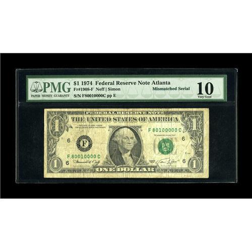 <B>Fr. 1908-F $1 1974 Federal Reserve Note. PMG Very Good 10.</B></I><BR>This is a neat two digit mismatch which carries the fancy 80010000/80100000 serial number.<BR><BR><b>Shipping:</b> Coin/Currency (<a target="_blank" href="http://www.heritageauctions.com/common/shipping.php">view shipping information</a>)