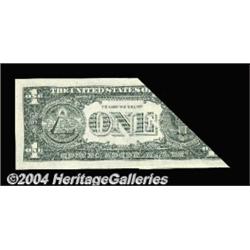 Fr. 1908-G $1 1974 Federal Reserve Note. Gem Crisp Uncirculated. A dramatic foldover indeed, but this is not your typical foldover error, as the district seal is printed over the end of the left serial number. The only explanation that seems logical to us is that somehow the third printing was applied twice on the folded area, but we certainly can not explain how that might have occurred. This is a combination we've not seen previously, so any estimate here is just a guess, but our feeling is that this interesting note should be worth... <BR><BR><B>Important notice:</B> Heritage usually auctions material at the rate of 200-250 lots per hour. On some occasions eBay Live bid software or the Internet may not be able to keep up with the pace of the auction. We recommend placing a realistic absentee bid now as insurance to avoid disappointment. Occasionally the auctioneer may eliminate or reject an eBay Live bid, and the auctioneer may also reopen a lot after the close of the eBay live bidding (usually because we missed an audience bid), and may reject your bid even if it shows you as the winning bidder. By bidding via eBay Live, you agree that Heritage may award the lot to another bidder at its sole discretion under the circumstances described above or any other reasonable circumstances. Since eBay bids are not shown to us until we open the lot on the floor, we treat those bids just like floor bids. In most cases the floor responds before the eBay bid is presented to us, due to Internet lag time, so for consistency we have made it a policy that floor bids are always considered first over tie eBay live bids. Also please note that all Heritage lots purchased through eBay Live carry a 20% Buyer's Premium. Please make sure you read the Terms and Conditions before you bid. <BR><BR><B>IMPORTANT ANNOUNCEMENT ABOUT RESERVES:</B> Heritage now divulges all reserves on its web site 7 days before every auction. If you want to know whether the reserve on this lot has been met, and if not, what the reserve amount is, please visit this lot page on the HeritageCoin.com web site, or email: bid@HeritageGalleries.com