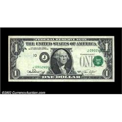 Fr. 1908-J $1 1974 Federal Reserve Note. Extremely Fine. The third printing is sharply skewed to the right, intruding slightly into the portrait. Important notice: We expect to be auctioning lots at the rate of 200-250 per hour. Sometimes eBay Premier live bid software cannot keep up with that pace, so we strongly recommend that you place a realistic proxy bid now as insurance to avoid disappointment. Also please note that all Heritage/CAA lots purchased through eBay Premier carry a 20% Buyer's Premium. Please make sure you read the Terms and Conditions.