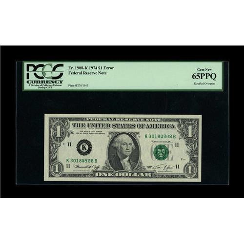 <B>Fr. 1908-K $1 1974 Federal Reserve Note. PCGS Gem New 65PPQ.</B></I><BR>This note features a complete double printing of the third print which has given this note a pair of serial numbers.<BR><BR><b>Shipping:</b> Coin/Currency (<a target="_blank" href="http://www.heritageauctions.com/common/shipping.php">view shipping information</a>)