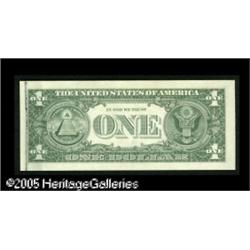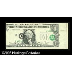 <B>Fr. 1908-L $1 1974 Federal Reserve Note. Choice Crisp Uncirculated.</B></I> This note displays two errors, a massive cutting error that leaves a large amount of right-hand selvage showing, and a glaring third printing shift. Lot:15374