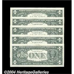 Fr. 1908-L $1 1974 Federal Reserve Notes. Gem Crisp Uncirculated. An interesting five note set, with the middle note displaying the third printing on its reverse, the four bookends (two on each side) being absolutely normal. 5 notes <BR><BR><B>Important notice:</B> Heritage usually auctions material at the rate of 200-250 lots per hour. On some occasions eBay Live bid software or the Internet may not be able to keep up with the pace of the auction. We recommend placing a realistic absentee bid now as insurance to avoid disappointment. Occasionally the auctioneer may eliminate or reject an eBay Live bid, and the auctioneer may also reopen a lot after the close of the eBay live bidding (usually because we missed an audience bid), and may reject your bid even if it shows you as the winning bidder. By bidding via eBay Live, you agree that Heritage may award the lot to another bidder at its sole discretion under the circumstances described above or any other reasonable circumstances. Since eBay bids are not shown to us until we open the lot on the floor, we treat those bids just like floor bids. In most cases the floor responds before the eBay bid is presented to us, due to Internet lag time, so for consistency we have made it a policy that floor bids are always considered first over tie eBay live bids. Also please note that all Heritage lots purchased through eBay Live carry a 20% Buyer's Premium. Please make sure you read the Terms and Conditions before you bid. <BR><BR><B>IMPORTANT ANNOUNCEMENT ABOUT RESERVES:</B> Heritage now divulges all reserves on its web site 7 days before every auction. If you want to know whether the reserve on this lot has been met, and if not, what the reserve amount is, please visit this lot page on the HeritageCoin.com web site, or email: bid@HeritageGalleries.com