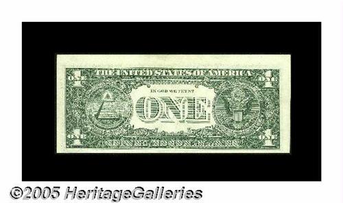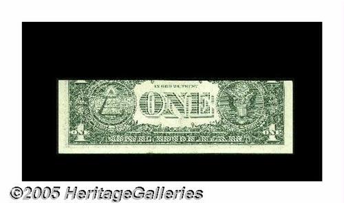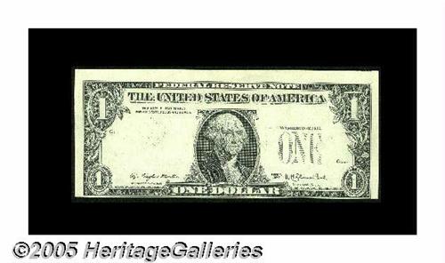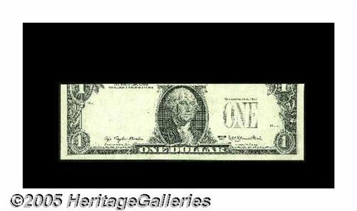 <B>Fr. 1909-? $1 1977 Federal Reserve Note. Gem Crisp Uncirculated.</B></I> This pair was in a Lyn Knight auction, described thusly, "This puzzling pair first showed up 20 years ago on the cover of a price list booklet by Harry Jones, the dean of paper money errors. As the story goes, there were 102 "notes" in the pack. Neither of these has any sort of overprint. What makes this pair so unusual, is that they are the wrong size. One is cut too short (face plate #H1200), while the other is marginally too tall (face plate #G1200). In the intervening two decades, no other examples have come to light. Difficult to explain, easy to appreciate." We agree very much.<BR>
