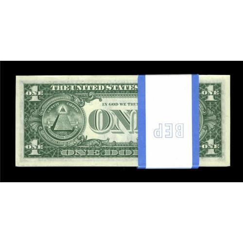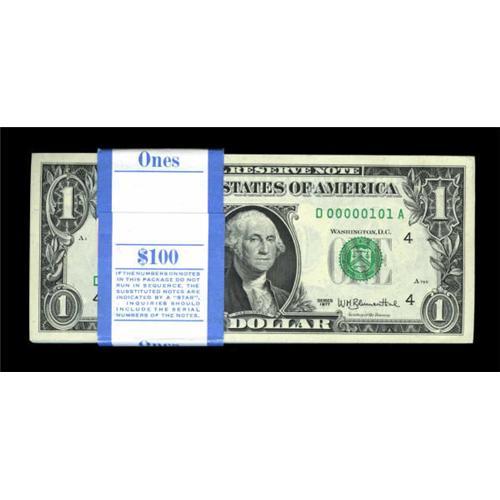<B>Fr. 1909-D $1 1977 Federal Reserve Notes. Original Pack of Low Serial Numbers. Gem Crisp Uncirculated.</B></I><BR> This is a well preserved Cleveland pack that contains serial numbers 101-200. All notes have wide margins and they are nicely centered. A couple of the notes do have minor corner bumps. A low serial number pack remaining intact is a highly unusual occurrence.<BR><I>From The Drew Keough Collection</B></I><BR><BR><b>Shipping:</b> Coins & Currency (<a target="_blank" href="http://www.heritageauctions.com/common/shipping.php">view shipping information</a>)