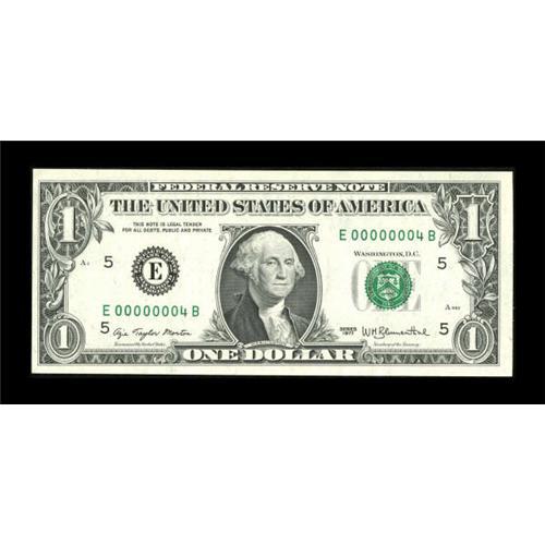 <B>Fr. 1909-E $1 1977 Federal Reserve Note. Serial Number Four. Choice Crisp Uncirculated.</B></I><BR> This note from the E-B block carries serial number E00000004B. The surfaces are very original with a tight left hand margin the reason for the grade.<BR><BR><b>Shipping:</b> Coins & Currency (<a target="_blank" href="http://www.heritageauctions.com/common/shipping.php">view shipping information</a>)