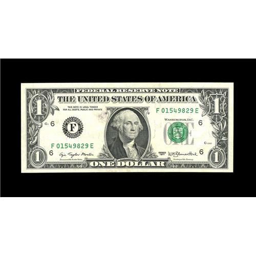<B>Fr. 1909-F $1 1977 Federal Reserve Note. Crisp Uncirculated.</B></I><BR>Another pleasing blank back error with a bit of wave from being wet at one time.