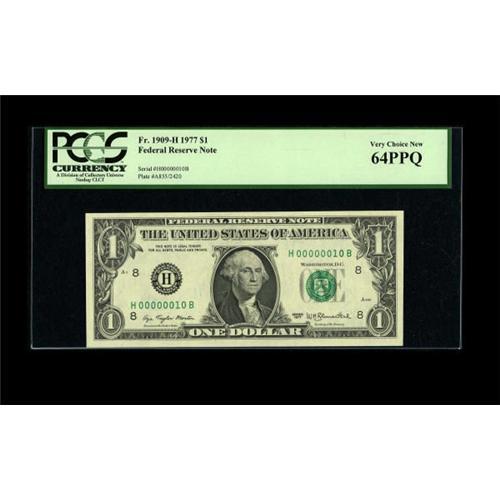 <B>Fr. 1909-H $1 1977 Federal Reserve Note. PCGS Very Choice New 64PPQ.</B></I><BR> This near-Gem ace boasts Serial Number 10. The paper is original and most pleasing. This is the lowest serial number we've handled for this issue.<BR><BR><b>Shipping:</b> Coins & Currency (<a target="_blank" href="http://www.heritageauctions.com/common/shipping.php">view shipping information</a>)