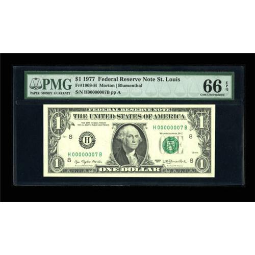 <B>Fr. 1909-H $1 1977 Federal Reserve Note. PMG Gem Uncirculated 66 EPQ.</B></I><BR> This Serial Number 7 is a beauty, with full margins and great embossing. The Serial Number 10 issue is also offered in this auction.<BR><BR><b>Shipping:</b> Coins & Currency (<a target="_blank" href="http://www.heritageauctions.com/common/shipping.php">view shipping information</a>)