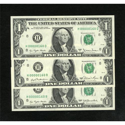 <B>Fr. 1909-H, 1910-H, 1911-H $1 1977, 1977A, 1981 Federal Reserve Notes. Matched Serial Number 160 Set Very Choice Crisp Uncirculated</B></I>.<BR> The notes within this set are from the H-B and H-D blocks and carry serial number 160 for the three series represented.<BR><BR><b>Shipping:</b> Coins & Currency (<a target="_blank" href="http://www.heritageauctions.com/common/shipping.php">view shipping information</a>)