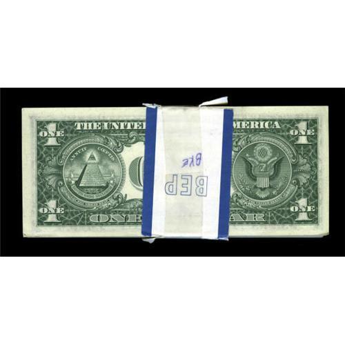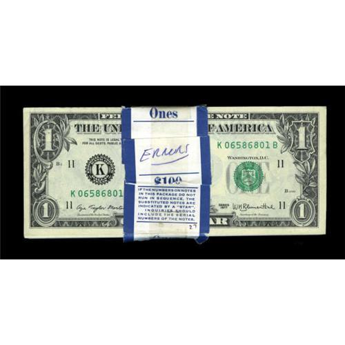 <B>Fr. 1909-K $1 1977 Federal Reserve Notes. Ninety-four Examples. Choice Crisp Uncirculated.</B></I> The BEP band for this grouping has "Errors" written on it. This leads to discovering that 21 notes have "Gas Pump" or partially turned digit errors<B>. </B></I>The numbering wheels were improperly working to produce these error notes that have serial numbers in a state of limbo. It is the last digit of the upper right serial number that is affected. The first note in the pack shows handling and six notes are missing from this pack.<I><BR>From The Drew Keough Collection</B></I><BR><BR><b>Shipping:</b> Coins & Currency (<a target="_blank" href="http://www.heritageauctions.com/common/shipping.php">view shipping information</a>)