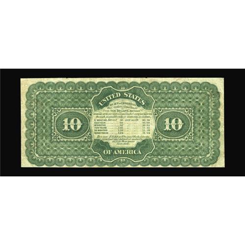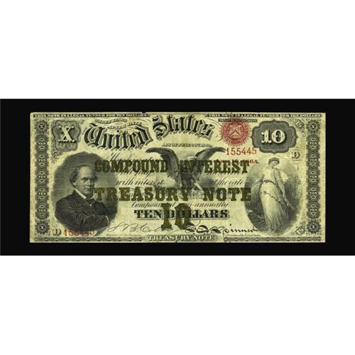 <B>Fr. 190b $10 1864 Compound Interest Treasury Note Very Fine.</B></I> Two thirds of the surviving population for this issue grade Fine or lower, and while there are a decent number of VF's reported, they are likely not as nice as this wholly original specimen. The vast majority of these pieces show heavy damage or restoration. Close scrutiny of this piece reveals a few millimeter long splits in the margin, and most importantly no repairs. Moreover, the internal portion of the paper is uncompromised and the overprint bold with some coruscation.<BR><I>From The Plymouth Rock Collection</B></I>