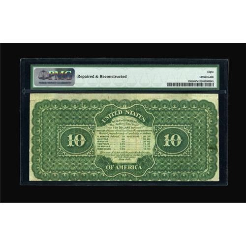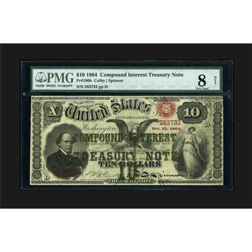 <B>Fr. 190b $10 1864 Compound Interest Treasury Note PMG Very Good 8 Net.</B></I> This note has been Repaired and Reconstructed according to PMG, but regardless this restoration has improved the eye appeal tremendously compared to what it once was. Coming from an issue where original notes are elusive, it should receive serious bidder attention this evening. The repairs have been quite professionally executed, effectively bringing a tough note back to life to be enjoyed for countless generations.<BR><BR><b>Shipping:</b> Coins & Currency (<a target="_blank" href="http://www.heritageauctions.com/common/shipping.php">view shipping information</a>)