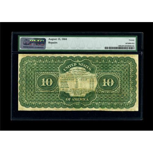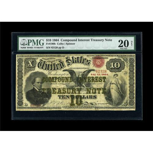 <B>Fr. 190b $10 1864 Compound Interest Treasury Note PMG Very Fine 20 NET.</B></I> Track & Price lists 92 examples of this Friedberg number. We sold this piece in our January 1997 sale, where we described it, "This good-looking note has lots of original color and excellent eye appeal. It is essentially defect-free, but it has some minor restorations at the edges, none of which appears to reach any part of the design. The restorations are virtually invisible, and the overall appearance of the note is outstanding." PMG has noted, "Repairs."<BR><BR><b>Shipping:</b> Coins & Currency (<a target="_blank" href="http://www.heritageauctions.com/common/shipping.php">view shipping information</a>)