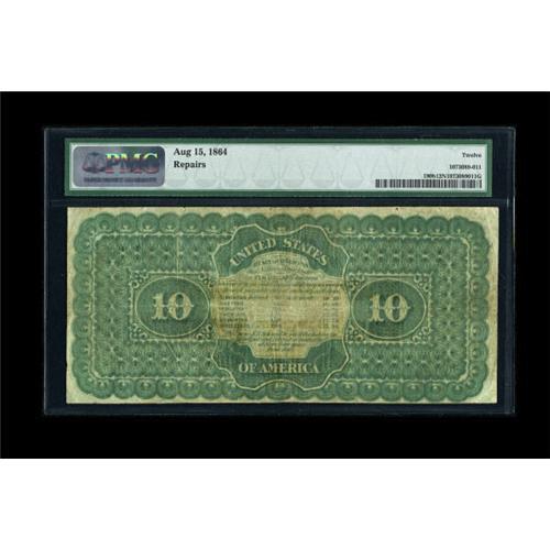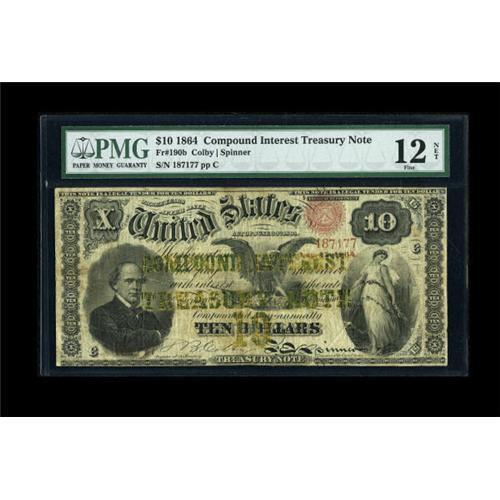 <B>Fr. 190b $10 1864 Compound Interest Treasury Note PMG Fine 12 NET.</B></I> Far better looking than what one would expect for the grade, and with only the very most minor of repairs to the outer edges. PMG has noted, "Repairs," but they are nothing like what is normally seen on these. The colors are good, and the note faces up very nicely.<BR><BR><b>Shipping:</b> Coins & Currency (<a target="_blank" href="http://www.heritageauctions.com/common/shipping.php">view shipping information</a>)