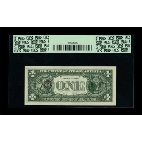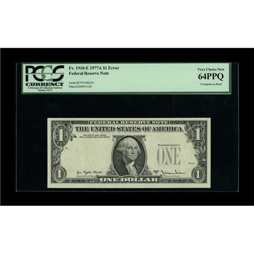 <B>Fr. 1910-E $1 1977A Federal Reserve Note. PCGS Very Choice New 64PPQ.</B></I><BR>The third printing is on the back rather than its proper position on the face of this certified note. What makes this example truly special, however, is the fact that it appears on a special experimental paper designed to test the durability of various paper formulae. These Natick test paper notes can be identified by their serial number range E76000001H through E80640000H, although research by small size specialist Robert Azpiazu and others indicates that large gaps exist in the numbering sequence, suggesting that the actual number of notes printed is less than the serial number range would suggest. This certified example is one of an infinitesimally small number known to exist on Natick test paper and based on both its rarity and exceptional quality should generate bids in the range of...<BR><BR><b>Shipping:</b> Coin/Currency (<a target="_blank" href="http://www.heritageauctions.com/common/shipping.php">view shipping information</a>)