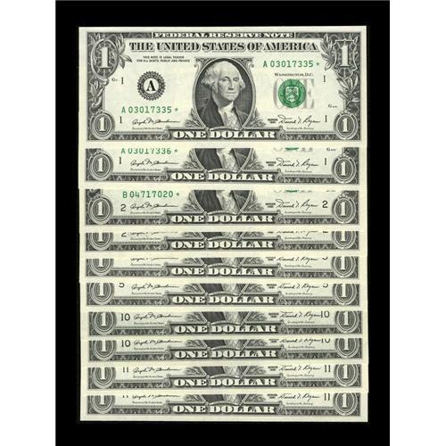 <B>Fr. 1911-A*, B*, E*, J*, K* $1 1981 Federal Reserve Notes. Fine Changeover Pair Sets Gem Crisp Uncirculated.</B></I><BR>Each set contains a regular star and a mule star which carries a high numbered 1977A back.<BR><BR><b>Shipping:</b> Coins & Currency (<a target="_blank" href="http://www.heritageauctions.com/common/shipping.php">view shipping information</a>)