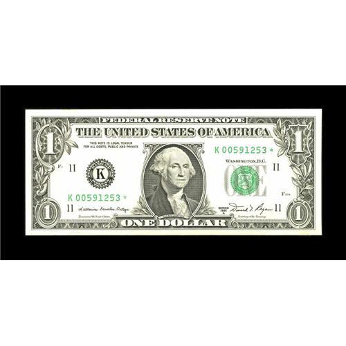 <B>Fr. 1912-K* $1 1981A Federal Reserve Note. Gem Crisp Uncirculated.</B></I><BR>In the Robert Azpiazu reference, <I>Collectors Guide to $1 FRNs Series 1963 - 2003A,</B></I> he lists this star as the second rarest at $1300 in CU.<BR><I>From The Rolling Plains Collection</B></I><BR><BR><b>Shipping:</b> Coins & Currency (<a target="_blank" href="http://www.heritageauctions.com/common/shipping.php">view shipping information</a>)