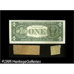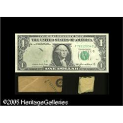 <B>Fr. 1913-F $1 1985 Federal Reserve Note Gem Crisp Uncirculated.</B></I> Another in a run of retained obstruction errors, the likes of which have never before been offered in one sale to the numismatic community. Each note in this section is an error of exceptional rarity and desirability, and the overall achievement of assembling so many of these rarities in one collection can not be overemphasized. This note has both the kraft paper and the tape present, with each having covered a different section of the third printing. Lot:15432