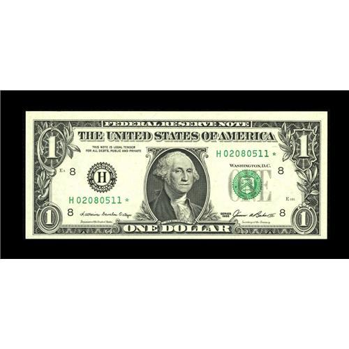 <B>Fr. 1913-H* $1 1985 Federal Reserve Note. Choice Crisp Uncirculated.</B></I><BR>This is a very scarce district for replacement notes on this series as very few have surfaced out of a print run of 640,000.<BR><BR><b>Shipping:</b> Coin/Currency (<a target="_blank" href="http://www.heritageauctions.com/common/shipping.php">view shipping information</a>)