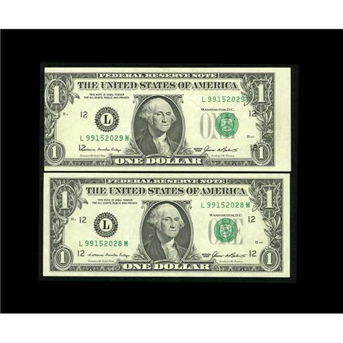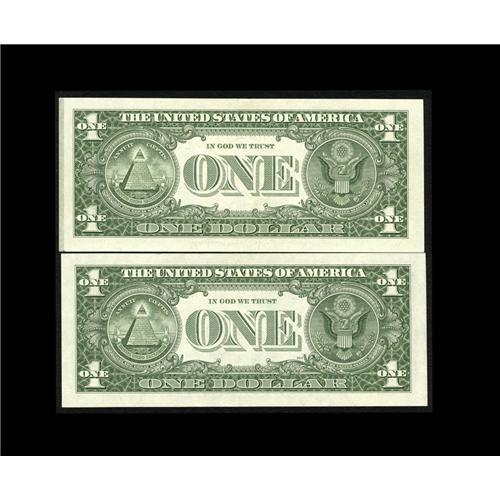 <B>Fr. 1913-L $1 1985 Federal Reserve Notes. Crisp Uncirculated.</B></I> The first note in this pair is normal, while the second note has a minor third printing shift, but it also shows on the back left-hand edge the tell-tale signs that signify the end of a paper roll.