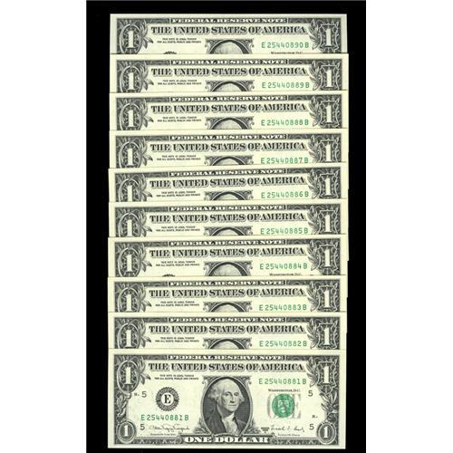 <B>Fr. 1914-E $1 1988A Federal Reserve Notes. Gem Crisp Uncirculated.</B></I><BR>A run of 10 consecutive notes with the faces normally printed and the left side of the backs displaying an area of underinking involving roughly 1/3 of each back. Consecutively numbered runs of errors are avidly sought by collectors in this specialty area.