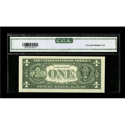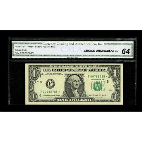 <B>Fr. 1914-F* $1 1988 Federal Reserve Note. CGA Choice Uncirculated 64.</B></I><BR>This piece is a near-consecutive note to two other notes offered in this auction and is a couple millimeters short on the top margin for a full Gem grade.<BR><BR><b>Shipping:</b> Coin/Currency (<a target="_blank" href="http://www.heritageauctions.com/common/shipping.php">view shipping information</a>)