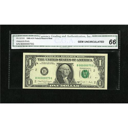 <B>Fr. 1915-B $1 1988A Federal Reserve Note. CGA Gem Uncirculated 66.</B></I><BR>Low serial number 75 is seen on this Ace from the B-G block.<BR><BR><b>Shipping:</b> Coins & Currency (<a target="_blank" href="http://www.heritageauctions.com/common/shipping.php">view shipping information</a>)