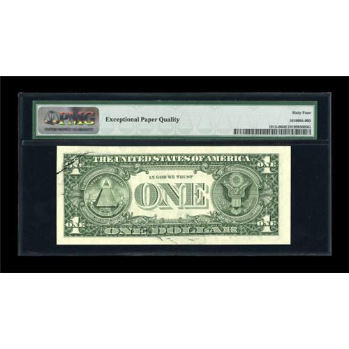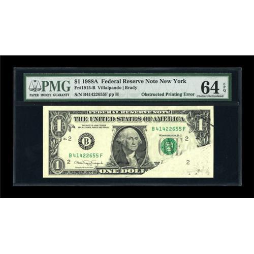 <B>Fr. 1915-B $1 1988A Federal Reserve Note. PMG Choice Uncirculated 64 EPQ.</B></I><BR> Multiple errors affect this note which suffered from printed tears as well as an obstruction at lower right. <BR><BR><b>Shipping:</b> Coins & Currency (<a target="_blank" href="http://www.heritageauctions.com/common/shipping.php">view shipping information</a>)