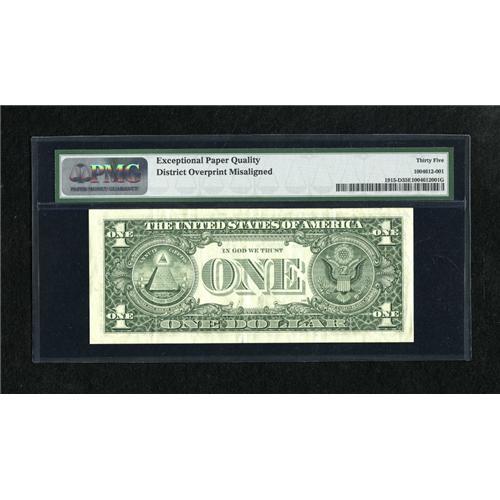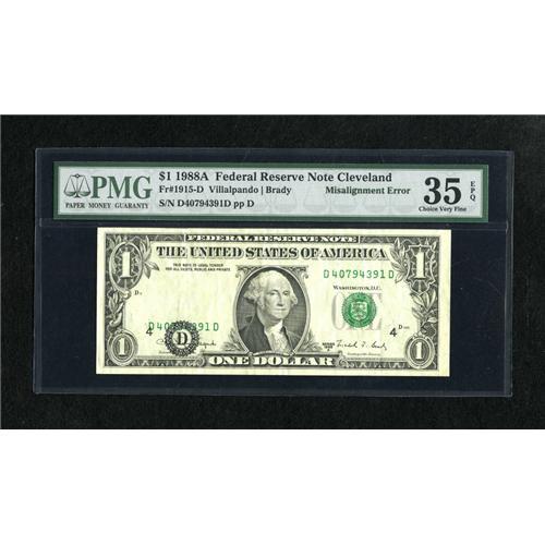 <B>Fr. 1915-D $1 1988A Federal Reserve Note. PMG Choice Very Fine 35 EPQ.</B></I><BR>The black overprint on this Ace was printed way low.<BR><BR><b>Shipping:</b> Coins & Currency (<a target="_blank" href="http://www.heritageauctions.com/common/shipping.php">view shipping information</a>)