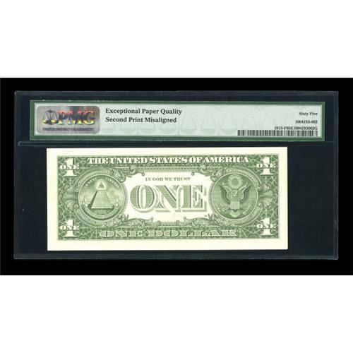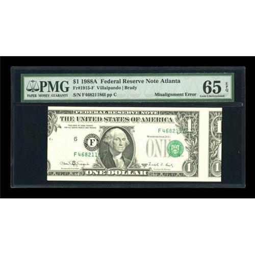 <B>Fr. 1915-F $1 1988A Federal Reserve Note. PMG Gem Uncirculated 65 EPQ.</B></I> A lovely PMG graded example of this very scarce and dramatic error, with the result being a seriously shifted third printing along with a major cutting miscue allowing portions of two notes to be present on this example.<BR><BR><b>Shipping:</b> Coins & Currency (<a target="_blank" href="http://www.heritageauctions.com/common/shipping.php">view shipping information</a>)