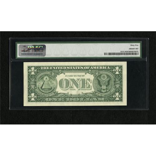 <B>Fr. 1915-J $1 1988A Federal Reserve Note. PMG Gem Uncirculated 65.</B></I><BR> An interesting offset with a mottled appearance dubbed a "Mat Offset" by PMG.<BR><BR><b>Shipping:</b> Coins & Currency (<a target="_blank" href="http://www.heritageauctions.com/common/shipping.php">view shipping information</a>)