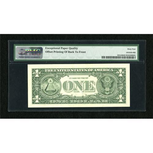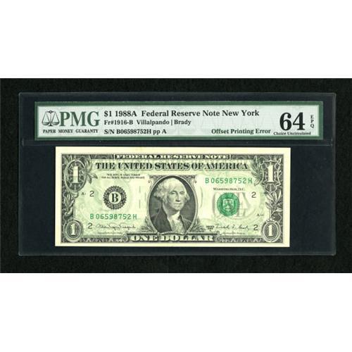<B>Fr. 1916-B $1 1988A Federal Reserve Note. PMG Choice Uncirculated 64 EPQ.</B></I><BR> A $1 note exhibiting a light offset of the back on the face.<BR><BR><b>Shipping:</b> Coins & Currency (<a target="_blank" href="http://www.heritageauctions.com/common/shipping.php">view shipping information</a>)