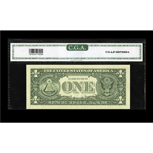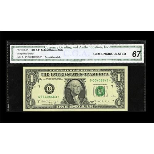 <B>Fr. 1916-G* $1 1988A Federal Reserve Note. CGA Gem Uncirculated 67.</B></I> One of a consecutive pair of these rare star mismatches that have realized as high as $3000 in previous sales. This piece appears to have truly merited its Gem Uncirculated 67 grade from CGA.