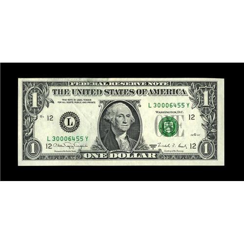<B>Fr. 1916-L $1 1988A Federal Reserve Note. Choice Crisp Uncirculated.</B></I><BR>The back right half is doubly inked. A crease in the paper is believed have been produced during production.<BR><BR><b>Shipping:</b> Coin/Currency (<a target="_blank" href="http://www.heritageauctions.com/common/shipping.php">view shipping information</a>)