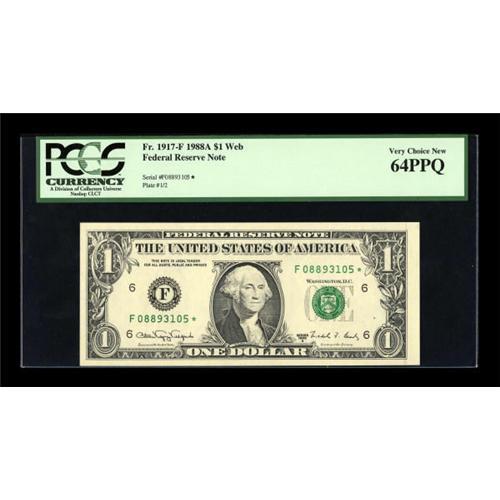 <B>Fr. 1917-F* $1 1988A Federal Reserve Web Note. PCGS Very Choice New 64PPQ.</B></I><BR> Always a popular piece due to the fact that the BEP erred when it included a small run of web stock notes to be overprinted as replacements.<BR><I>From The Drew Keough Collection</B></I><BR><BR><b>Shipping:</b> Coins & Currency (<a target="_blank" href="http://www.heritageauctions.com/common/shipping.php">view shipping information</a>)