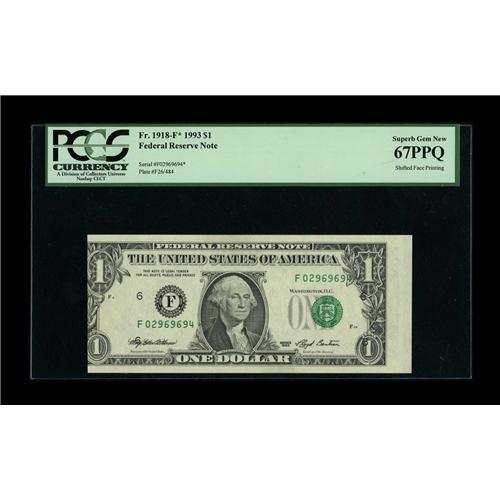 <B>Fr. 1918-F* $1 1993 Federal Reserve Note. PCGS Superb Gem New 67PPQ.</B></I><BR>Here is a gorgeous example that has the face printing moderately skewed, but it is on a replacement. Also, present is the roller guide mark that occurs on these types of errors.<BR><BR><b>Shipping:</b> Coin/Currency (<a target="_blank" href="http://www.heritageauctions.com/common/shipping.php">view shipping information</a>)